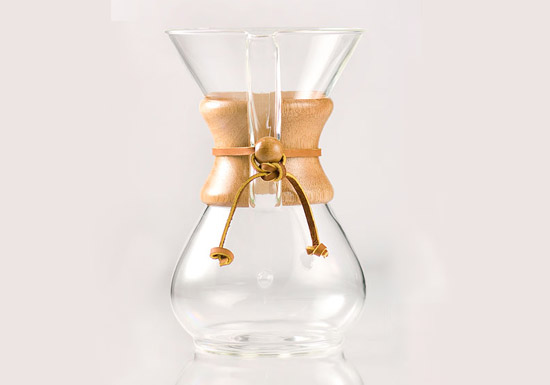 If at first glance you think that this coffee brewer has a striking resemblence to a chemistry beaker, you are correct. The Chemex Coffeemaker was invented in 1941 by a chemist from Berlin and his design has endured decades of ever-changing coffee brewing technology. This simple, but elegant hour-glass shaped brewer is made of heat-resistant glass with a polished wooden collar and rawhide tie. The wooden collar looks good and it also serves as an insulated handle to grasp while you pour the coffee.